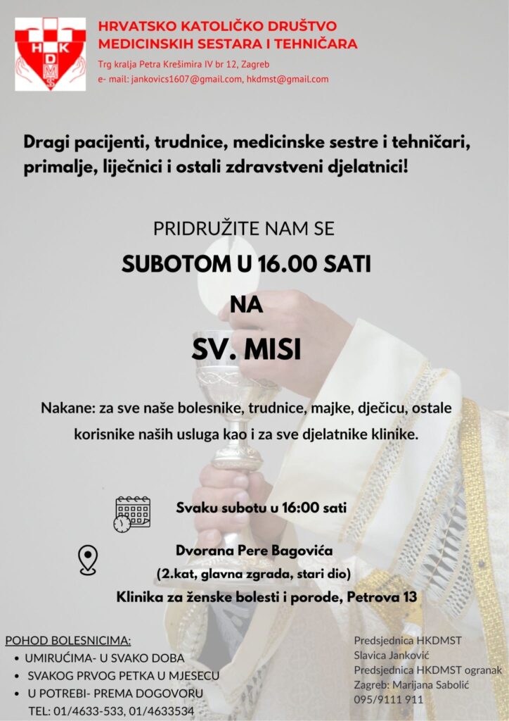 Svake subote do Cvjetnice misu u 16 sati slavit će svećenici iz Župe sv. Petra u Klinici za ženske bolesti i porode u Zagrebu.