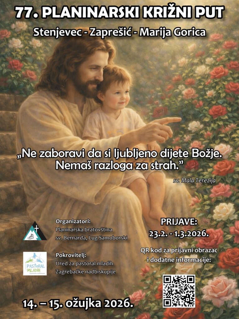 U organizaciji Planinarske bratovštine sv. Bernarda i pod pokroviteljstvom Ureda za pastoral mladih Zagrebačke nadbiskupije, u subotu i nedjelju 14. i 15. ožujka, održat će se 77. Planinarski križni put. Geslo PKP-a je „Ne zaboravi da si ljubljeno dijete Božje. Nemaš razloga za strah“.