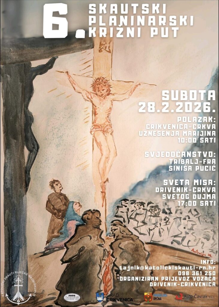 6. skautski planinarski križni put bit će održan 28. veljače. Okupljanje je najavljeno ispred crkve Uznesenja Marijina u Crikvenici od 9.30.