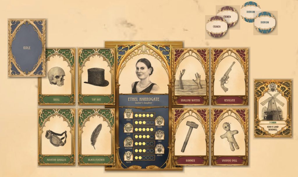 Igra se sastoji od šest vrsta karata (Dosjetka, Oružje, Trag, Lik, Uloga, Lokacija), dvije vrste žetona (Crimen i Dubium), dvije kocke te pravila, piše Gilbert.hr.