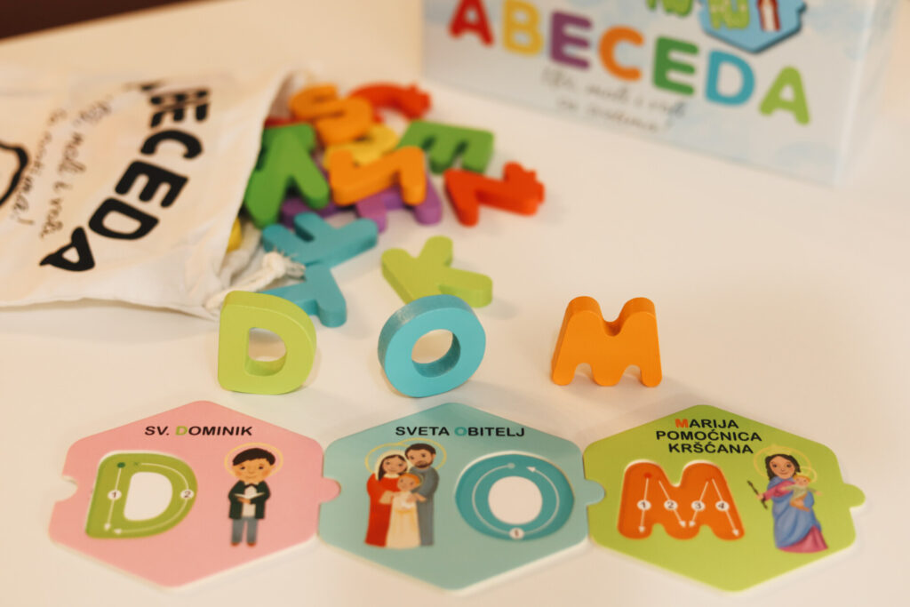 Treća igra ABECEDA (3+) sadrži 30 drvenih slova hrvatske abecede u različitim bojama, te 30 slagalica (puzzle) s ilustracijama nama bliskih svetaca. Pored ilustracija na pročelju svake slagalice se nalaze upute za pravilno pisanje svih slova hrvatske abecede.
