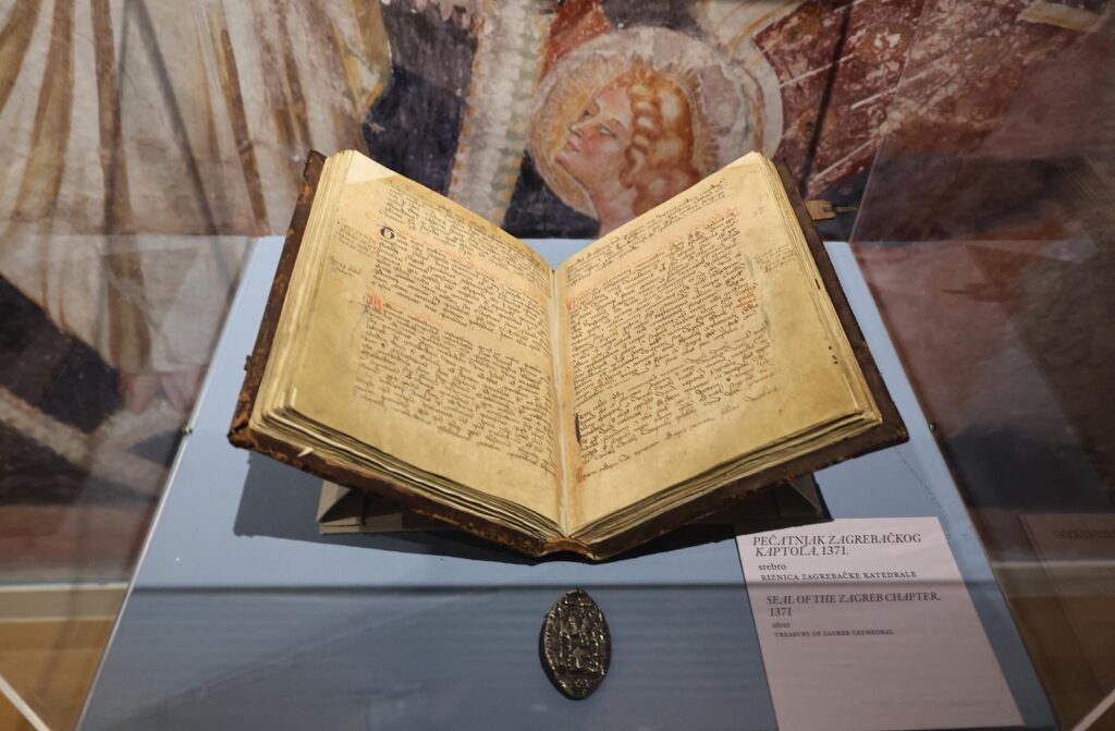 Iz Riznice zagrebačke katedrale na izložbi se mogu vidjeti Ladislavov plašt (11. – 14. st), Bjelokosni plenarij (11. – 17. st.), vezan uz osnivanje Zagrebačke biskupije, ali i drugi važni dokumenti i relikvijari, piše IKA.