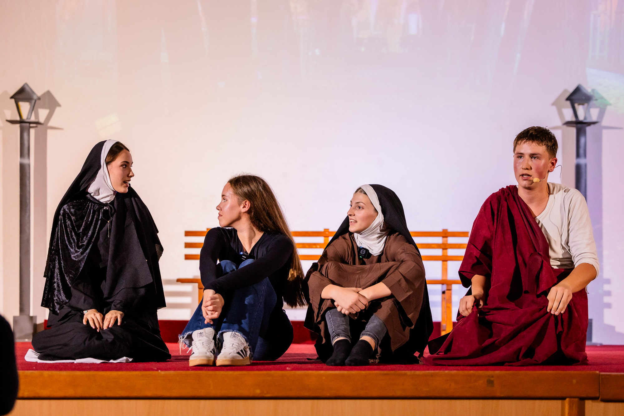 Salezijanska družba mladima se predstavila kroz duhoviti scenski „talk show“ koji je ugostio sv. Ivana Bosca, njegovog prvog suradnika i nasljednika don Mihovila Rua te današnjeg hrvatskog salezijanca don Davida Leskovara.