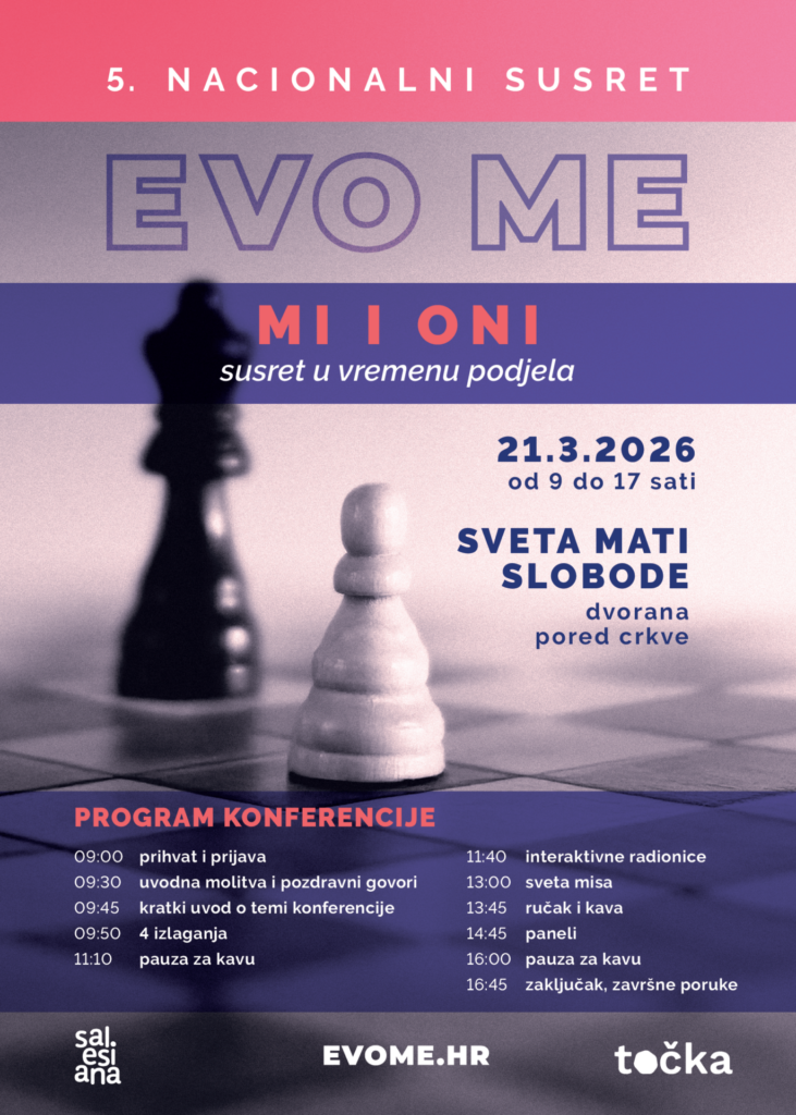 U vremenu sve izraženijih društvenih podjela, kada razlike sve rjeđe postaju prostor susreta, a sve češće razlog za sukob i isključivanje, projekt Evo me organizira 5. konferenciju pod nazivom „Mi i oni: Susret u vremenu podjela“.