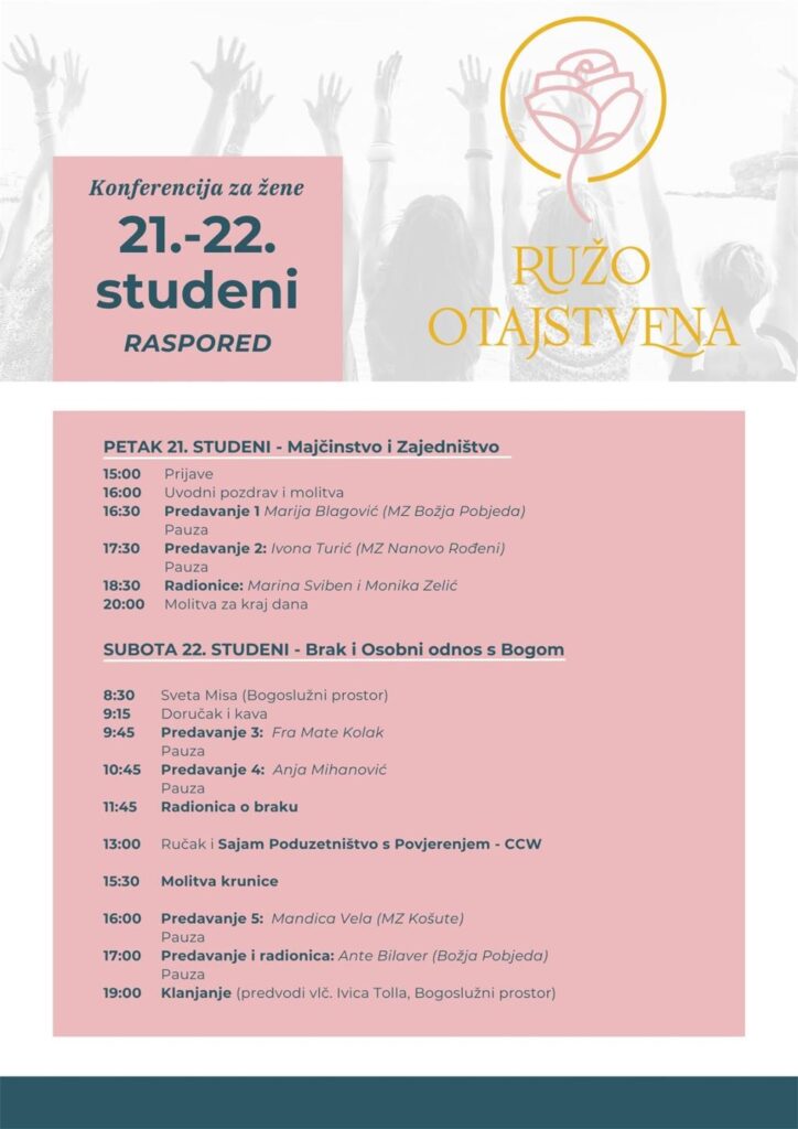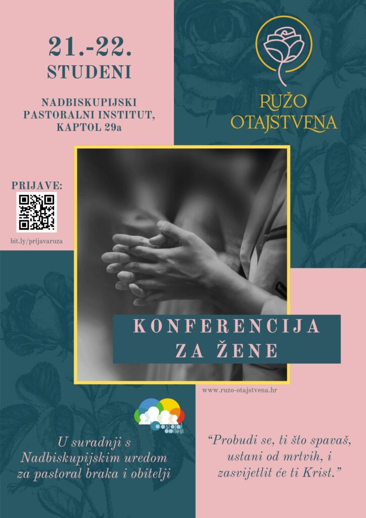 Duhovna konferencija za žene u braku „Ružo Otajstvena“ će se održati od 21. do 22. studenog 2025. u Zagrebu uz podršku Nadbiskupijskog ureda za pastoral braka i obitelji te zagrebačkog nadbiskupa Dražena Kutleše koji će otvoriti ovogodišnji susret.