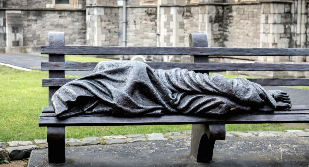 Skulptura nazvana Homeless Jesus (hrv. Beskućnik Isus) prikazuje Isusa kako sklupčan leži na klupi. Cijelo je tijelo pokriveno pokrivačem, vidljiva su tek stopala koja pokazuju rane od raspeća. Skulpturu je napravio kanadski kipar Timothy P. Schmalz. Umjetnik je došao na ideju da na tako originalan način predstavi Krista nakon što je, tijekom božićnih blagdana, vidio jednoga beskućnika kako spava na otvorenom, na klupi, piše IKA.