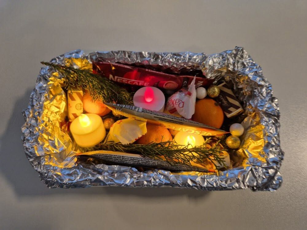 U jednoj plastičnoj kutijici – mislim da je ostala od kupljenog voća ili nečeg sličnog – bila je stavljena aluminijska folija, a unutar nje nekoliko grančica bora. Na njima su bile položene tri male svjećice, poput malih dušica. Uz to, nekoliko čokoladnih bombonijera, tri mini-vrećice kave i par mandarina.